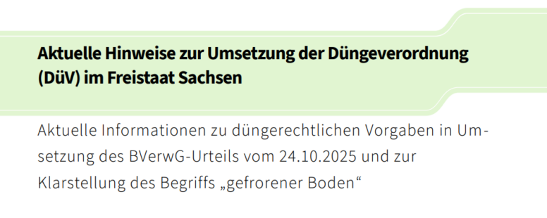 - Die zusätzlichen düngerechtlichen Anforderungen in den sächsischen Nitratgebieten („rote Gebiete“) werden bis auf Weiteres ausgesetzt und nicht kontrolliert und sanktioniert.