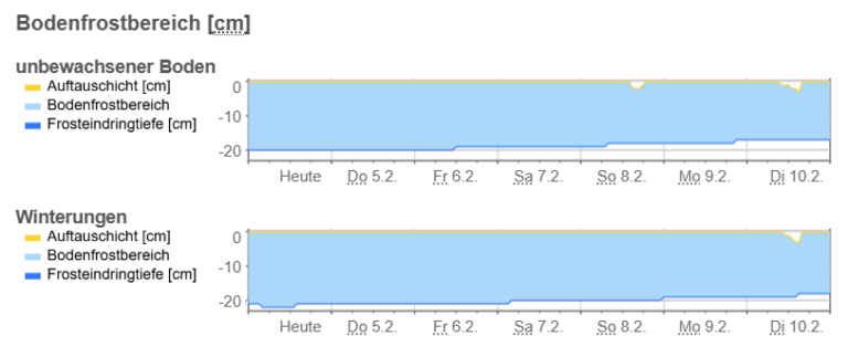 Es kommt drauf an. Nämlich mit welcher Technik man vorgeht und wie tief der Boden gefroren ist. Das wiederum hängt auch vom Bewuchs ab, wie in folgender Abbildung zu sehen sein könnte.