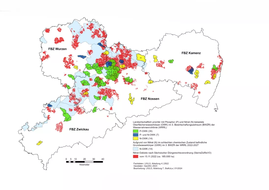 Durch die Novellierung der Düngeverordnung in 2017, deren erstmalige Anwendung in 2018 sowie die Festlegung der Nitratgebiete in der sächsischen Düngerechtsverordnung für die Düngesaison 2019 traten gravierende gesetzliche Änderungen in Kraft. Begleitend hierzu wurde vom Sächsischen Landesamt für Umwelt, Landwirtschaft und Geologie ein Projekt zur Umsetzung des „Landwirtschaftlichen Gewässerschutzes“ in diesen nitratsensiblen Gebieten initiiert, um gemeinsam mit der Landwirtschaft weitere effizienzsteigernde Methoden zu erproben und in der Praxis auch anzuwenden. Neben den nitratsensiblen Gebieten bzw. Grundwasserkörpern wurden durch kontinuierliche Messungen auch phosphorsensible Oberflächenwasserkörper detektiert. In diesen reliefbedingten erosionsanfälligen Regionen ist der Fokus vor allem auf den Bodenabtrag bzw. dessen Vermeidung gerichtet.