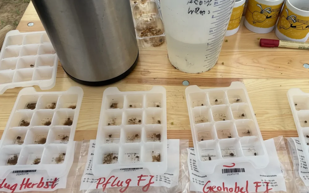 Die Infiltrationsgeschwindigkeit war bei Frühjahrsumbruch dem Herbstumbruch weit überlegen – statt in vier Minuten versickerten dort 25 l /m² innerhalb von gut 30 Sekunden. Dies ist ein Indikator für die negative Wirkung der Herbstbearbeitung auf die Oberflächenstruktur des schluffreichen Lössbodens.