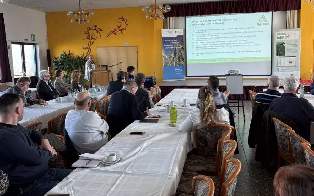 Dank des belebenden Vortrags von Enrico Jahn, Landwirt aus der Agraset-Agrargenossenschaft in Naundorf, wurde für alle spürbar, wie es ist, wenn jemand seinen Beruf als Berufung ansieht und sich aktiv in die Region einbringt, in der er auch lebt. Ob Schlagteilung auf hoch erosionsanfälligen Flächen, gleichmäßigere Verteilung der Organik über den Betrieb und damit Senkung des Mineraldüngereinsatzes oder auch die Anpassung der Düngung an den Pflanzenbedarf in der Teilfläche bis hin zur Umsetzung eigener Stickstoffsteigerungsversuche. „Einfach mal machen und Erfahrungen sammeln“. Vielen Dank an dieser Stelle auch von uns an Herrn Jahn und seine Mitarbeiter für die immer konstruktive und freundschaftliche Zusammenarbeit.