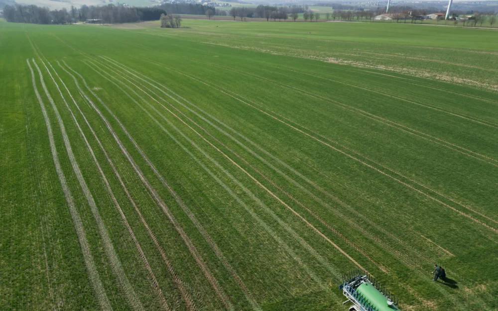 Die verdichtungsempfindlichen Lehmböden im Betrieb sind in normalen Jahren ab der zweiten Märzhälfte mit Gülletechnik befahrbar. Ist der Boden entsprechend abgetrocknet, verzeiht auch der Weizen das mehrfache Überrollen von Traktor und Tandemfass. Sind diese Bedingungen gegeben, ist es umso wichtiger, dass die Organik schnell in den Boden „einzieht“.