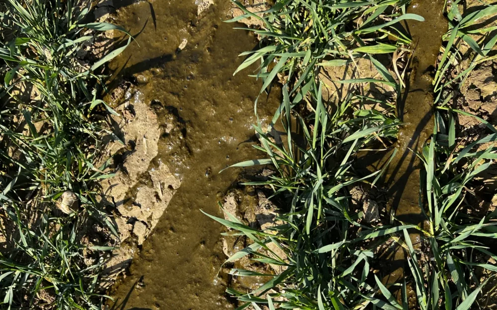 Ab April wird die Fläche bis zur letzten Düngergabe im Mai fortlaufend mit dem Nitratschnelltest begleitet. Weiterhin sind komplexe Pflanzenanalysen zum Zeitpunkt des Schossens angedacht. Die bereits am Tage der Ausbringung deutlich sichtbaren Unterschiede in den Fließeigenschaften der unbehandelten Rohgülle (Abbildung 6) und der aufbereiteten Dünnphase (Abbildung 5) dürften sich in nächster Zeit sowohl optisch als auch in den festgestellten Nährstoffkonzentrationen der Weizenpflanzen widerspiegeln.
